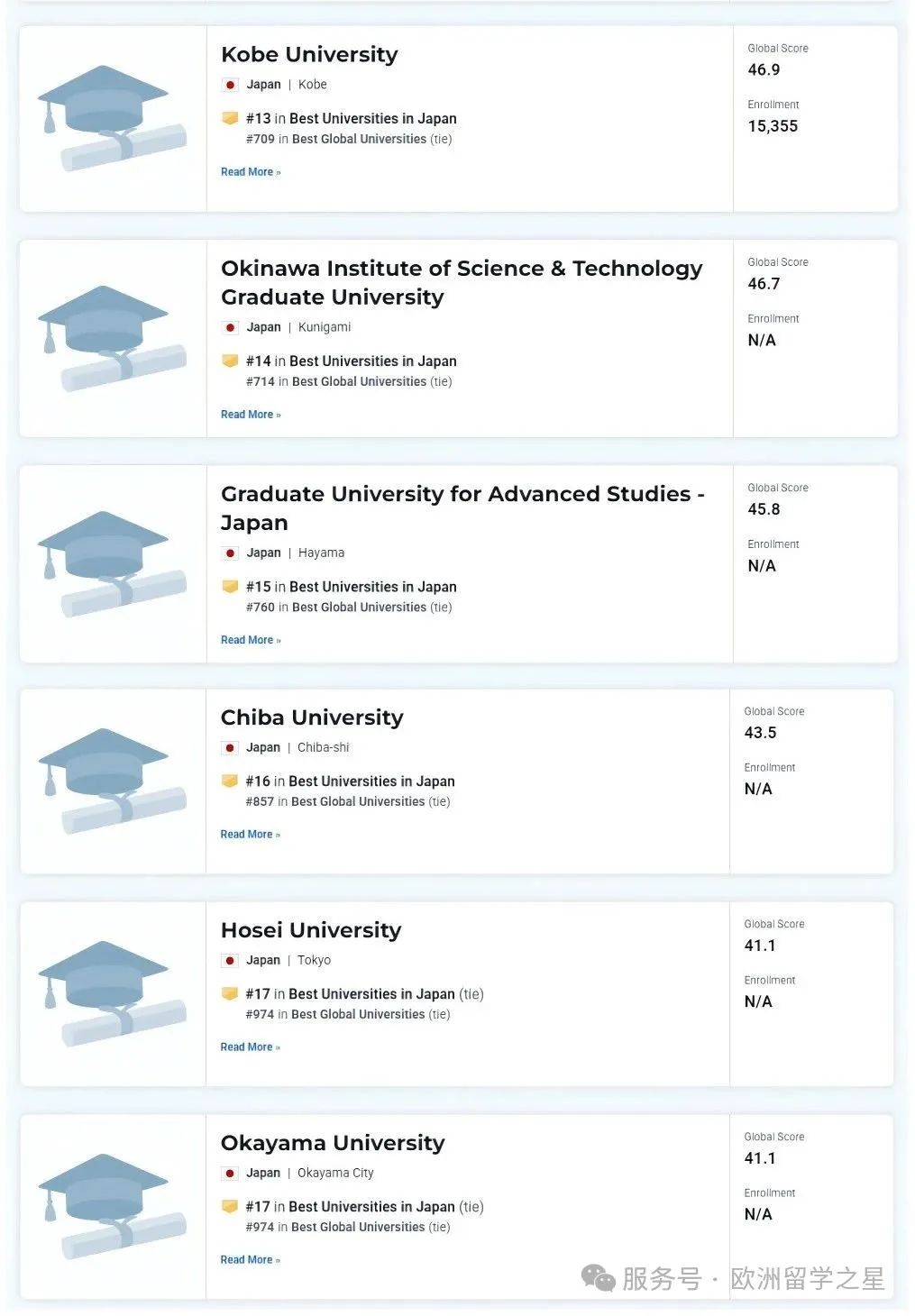 在2025-2026年的U.S.News 世界大学排名中,日本有八所学校进入TOP500,排名第一的依旧是东京大学(世界排名第84),排名第二的是京都大学(世界排名第187),第三是东北大学(世界排名第308),其次分别是大阪大学(世界排名第314),九州大学(世界排名第352),名古屋大学(世界排名第354),东京科学大学(世界排名第371)。