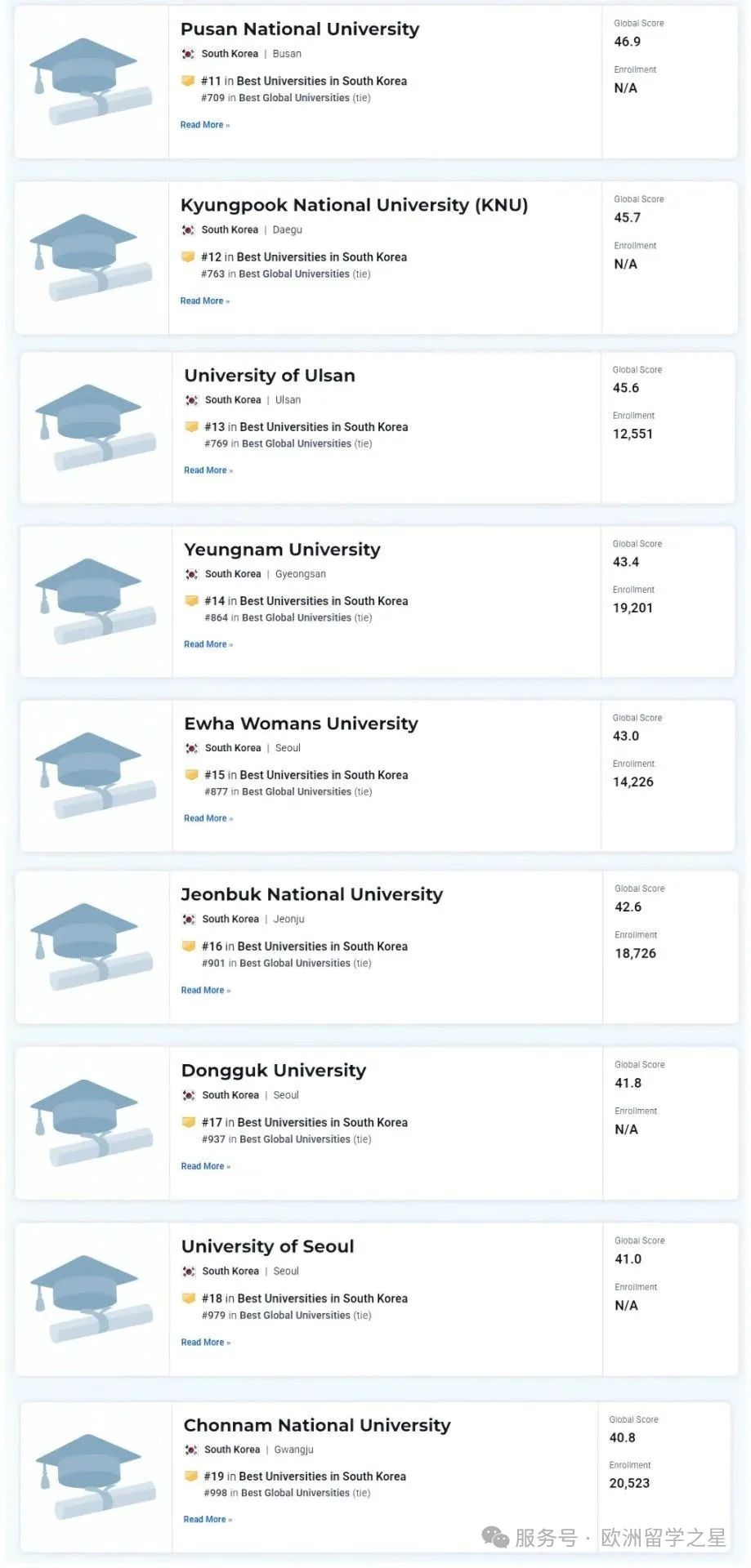 在2025-2026年的U.S.News 世界大学排名中,韩国有十所学校进入TOP500,排名第一的依旧是首尔大学(世界排名第133),排名第二的是延世大学(世界排名第180),第三是世宗大学(世界排名第238),其次分别是成均馆大学(世界排名第271),韩国科学技术研究所(世界排名第281),高丽大学(世界排名第288)。